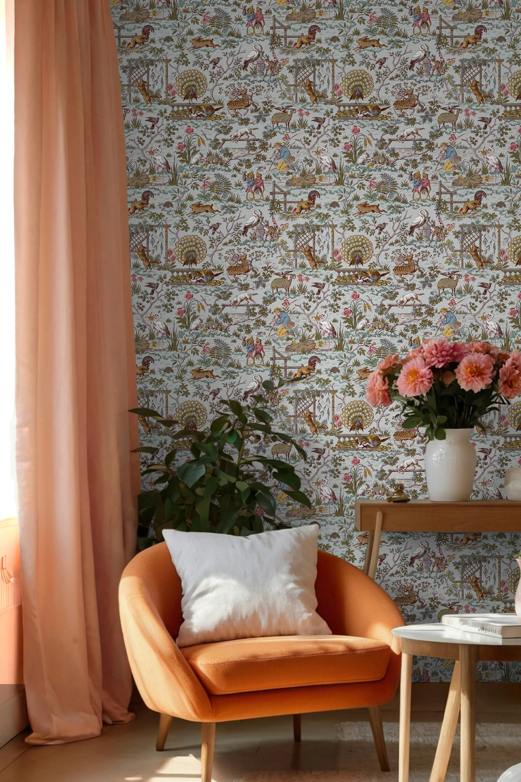 Originally block-printed in France in the 1860s, Fable revives an antique woodland scene alive with wonder. Frogs gather for a picnic, a stork pauses at a vessel, and hares bound through ferns and bellflowers beneath ambling trees. Reimagined for modern interiors, Fable comes in three distinct palettes.