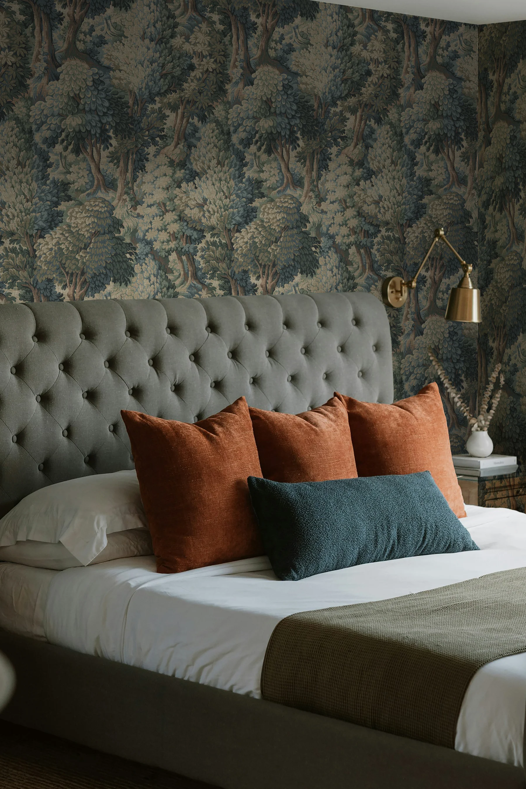 Orléans Forest is drawn from an antique French tapestry, reimagined as a wall covering that feels regal and restorative. The design carries the visual depth of hand-woven textiles, layered botanicals, softened edges, and a richness that reads as timeless. Though rooted in historic craftsmanship, Orléans settles easily into contemporary homes, offering texture, pattern, and grounded calm.